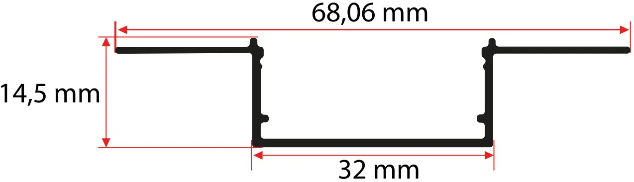 Toplam 68,06 mm genişlik, 14,5 mm derinlik ve 32 mm LED kanal genişliği ile tasarlanan bu trimless LED profil, yüksek lümenli ve geniş LED şeritlerin güvenle kullanılmasına olanak tanır. Geniş kanal yapısı sayesinde ışık homojenliği artar ve özellikle geniş tavan ve duvar yüzeylerinde güçlü bir aydınlatma performansı elde edilir.